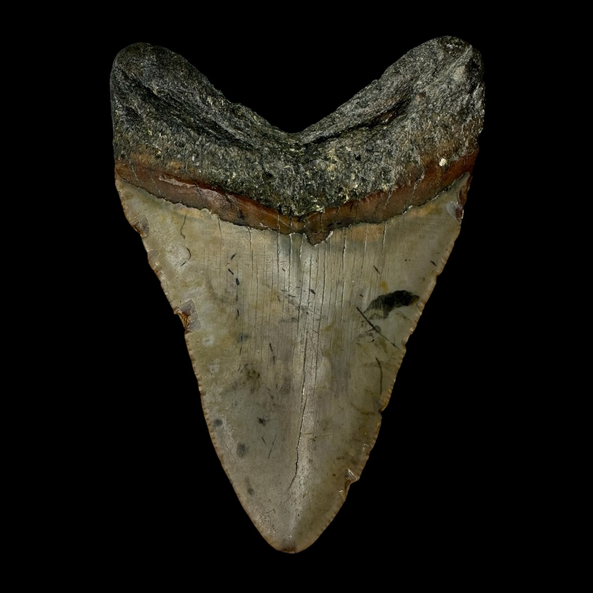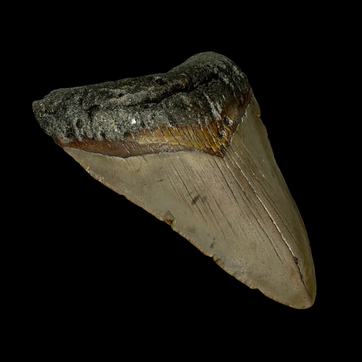 Every Megalodon tooth fossil we offer is completely natural, with no repairs or enhancements—just a light cleaning to remove marine deposits. Each piece is one-of-a-kind, showcasing its own distinctive coloration, sharp serrations, and natural gloss. This Megalodon tooth fossil is a true collector’s treasure, combining authenticity, prehistoric value, and unmatched detail.