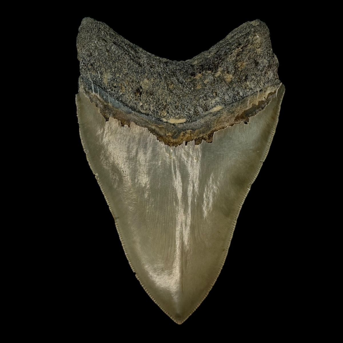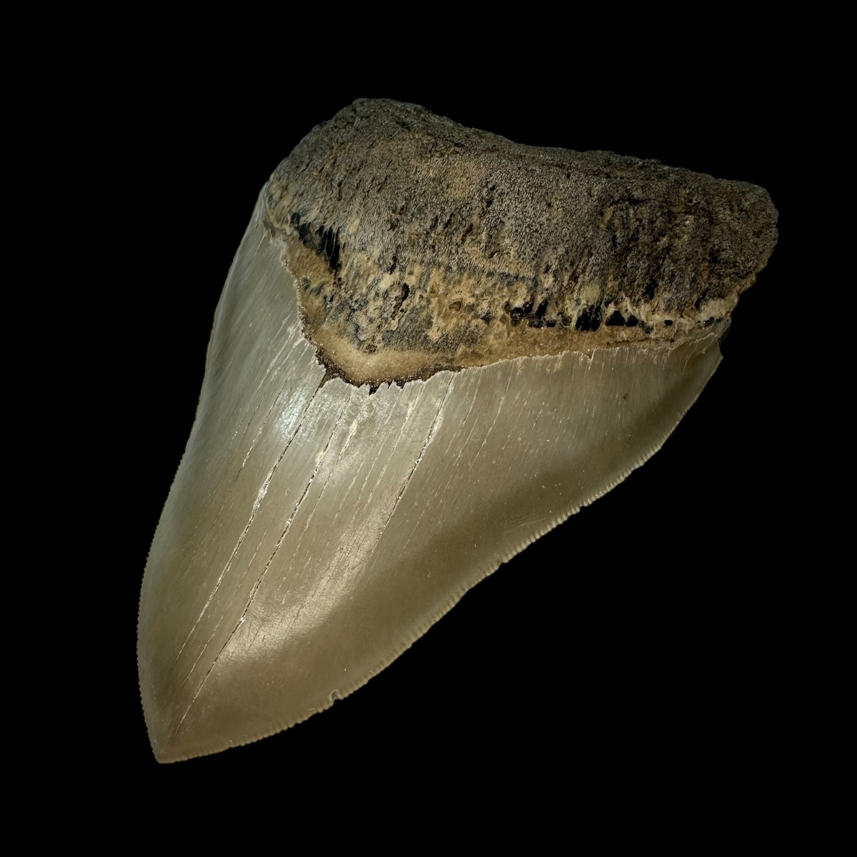 Every Megalodon tooth fossil we offer is completely natural, with no repairs or enhancements—just a light cleaning to remove marine deposits. Each piece is one-of-a-kind, showcasing its own distinctive coloration, sharp serrations, and natural gloss. This Megalodon tooth fossil is a true collector’s treasure, combining authenticity, prehistoric value, and unmatched detail.