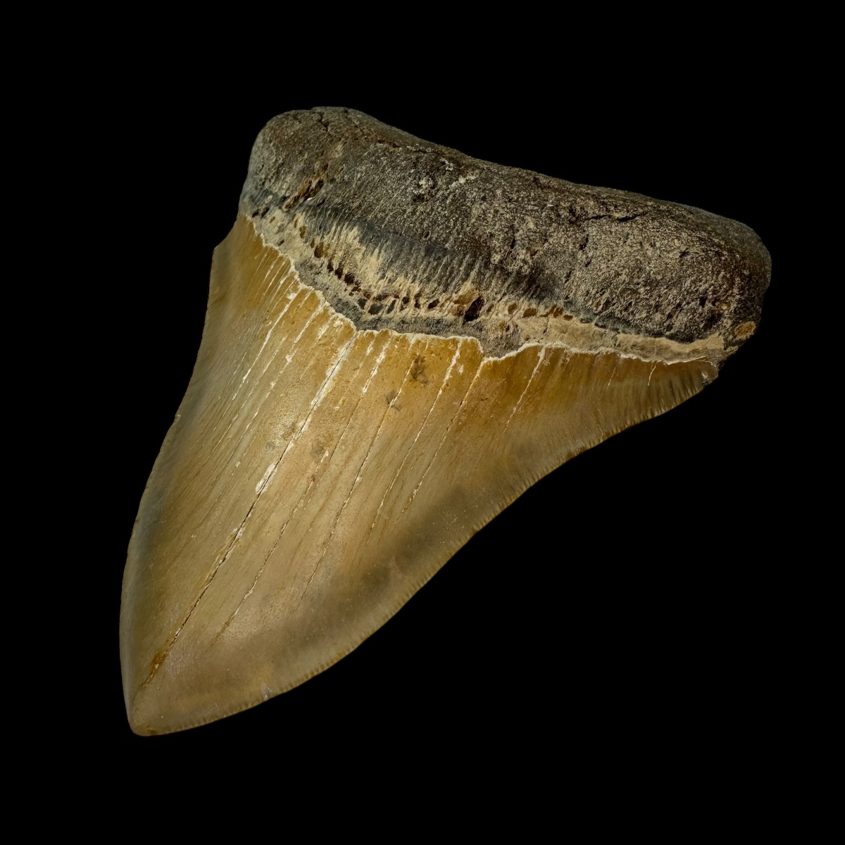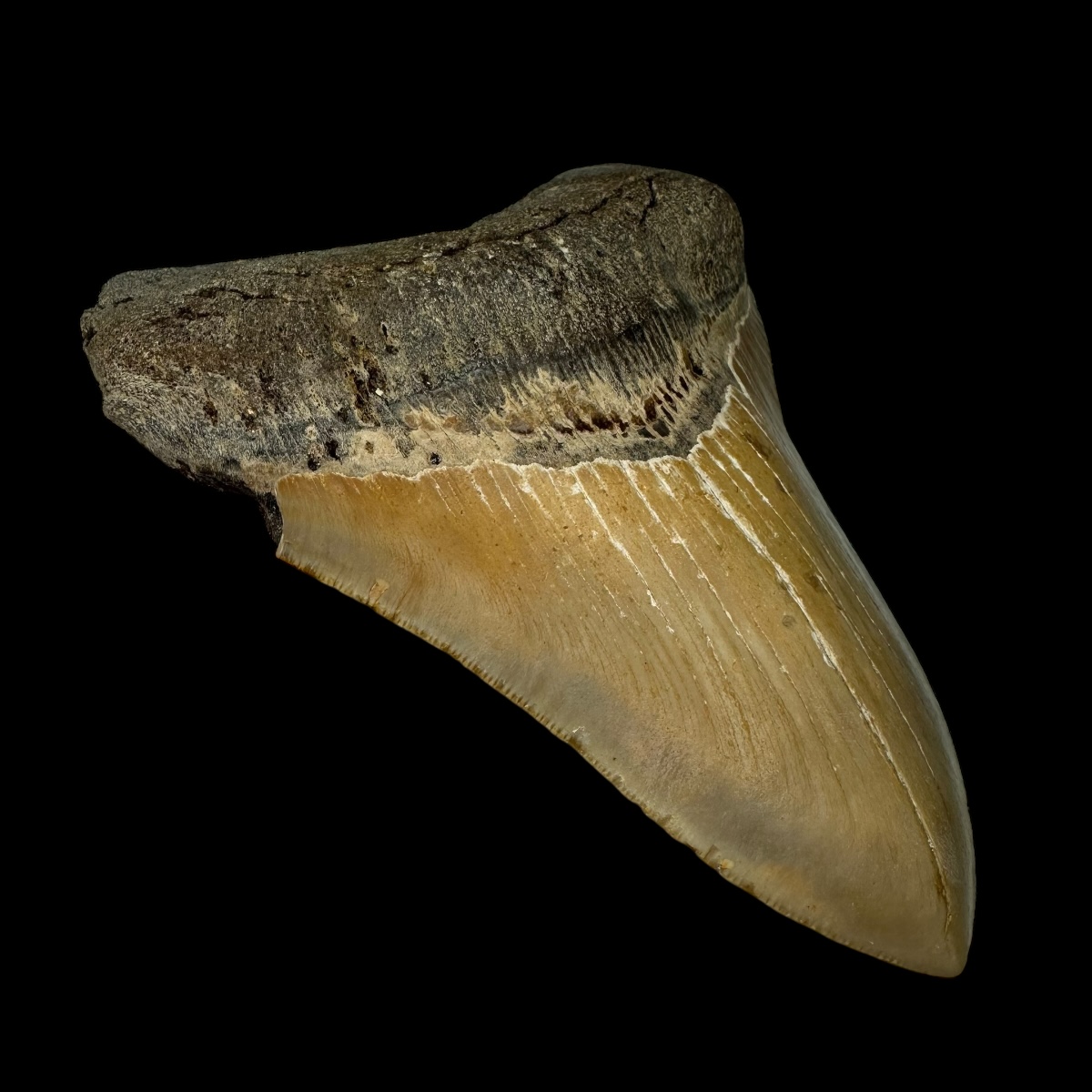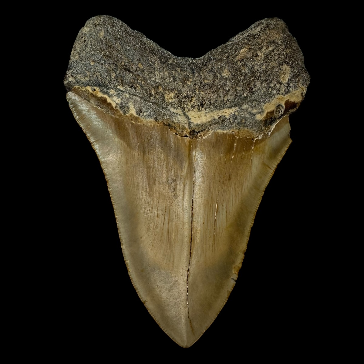 Every Megalodon tooth fossil we offer is completely natural, with no repairs or enhancements—just a light cleaning to remove marine deposits. Each piece is one-of-a-kind, showcasing its own distinctive coloration, sharp serrations, and natural gloss. This Megalodon tooth fossil is a true collector’s treasure, combining authenticity, prehistoric value, and unmatched detail.