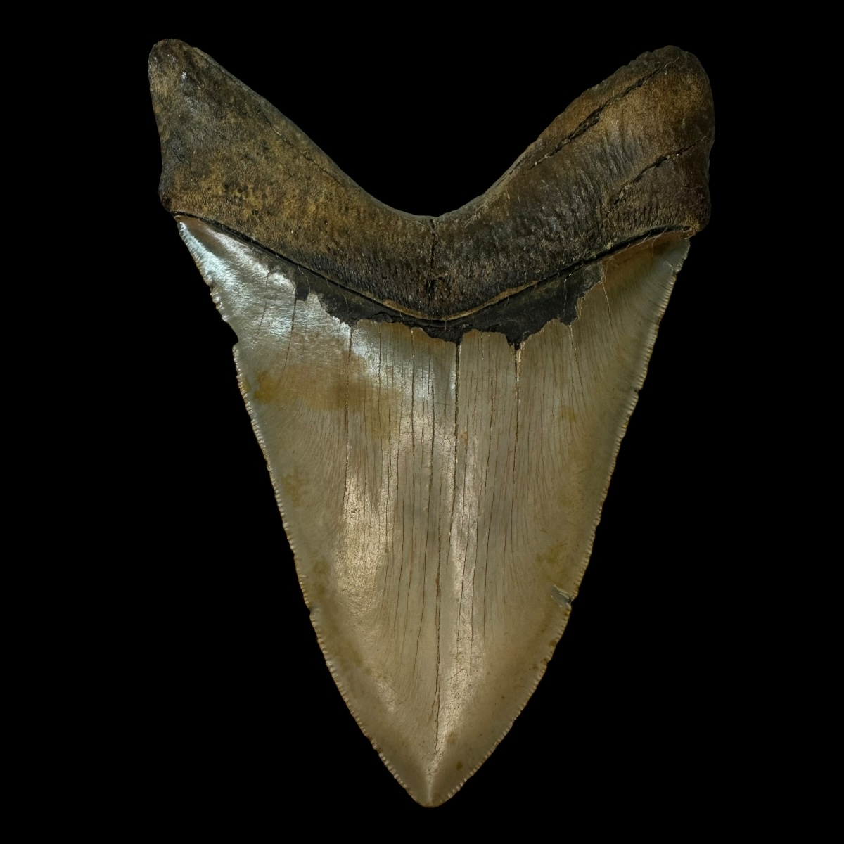Every Megalodon tooth fossil we offer is completely natural, with no repairs or enhancements—just a light cleaning to remove marine deposits. Each piece is one-of-a-kind, showcasing its own distinctive coloration, sharp serrations, and natural gloss. This Megalodon tooth fossil is a true collector’s treasure, combining authenticity, prehistoric value, and unmatched detail.