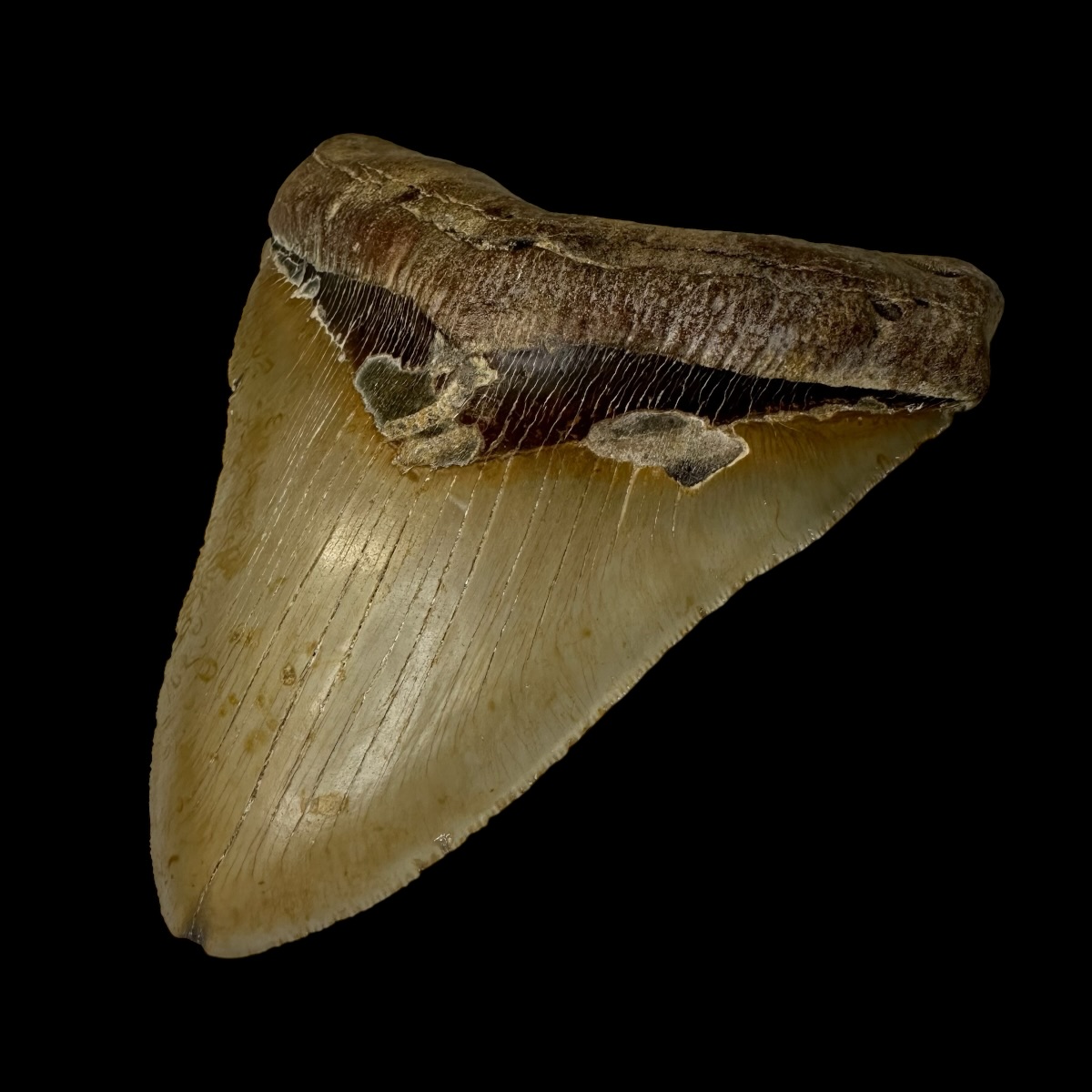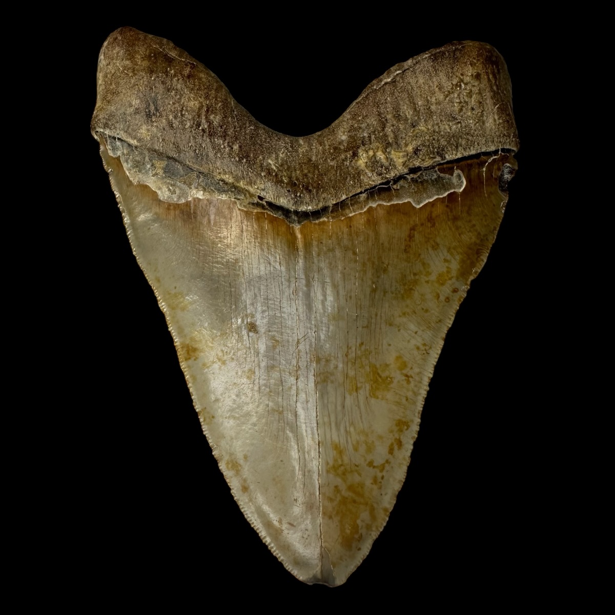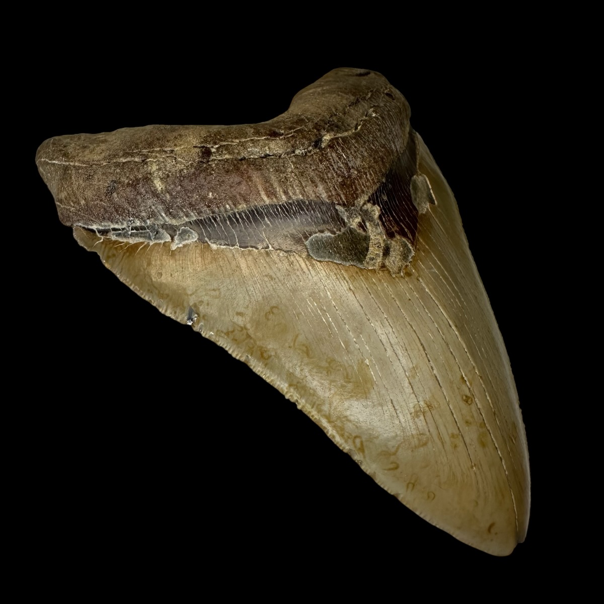 Every Megalodon tooth fossil we offer is completely natural, with no repairs or enhancements—just a light cleaning to remove marine deposits. Each piece is one-of-a-kind, showcasing its own distinctive coloration, sharp serrations, and natural gloss. This Megalodon tooth fossil is a true collector’s treasure, combining authenticity, prehistoric value, and unmatched detail.