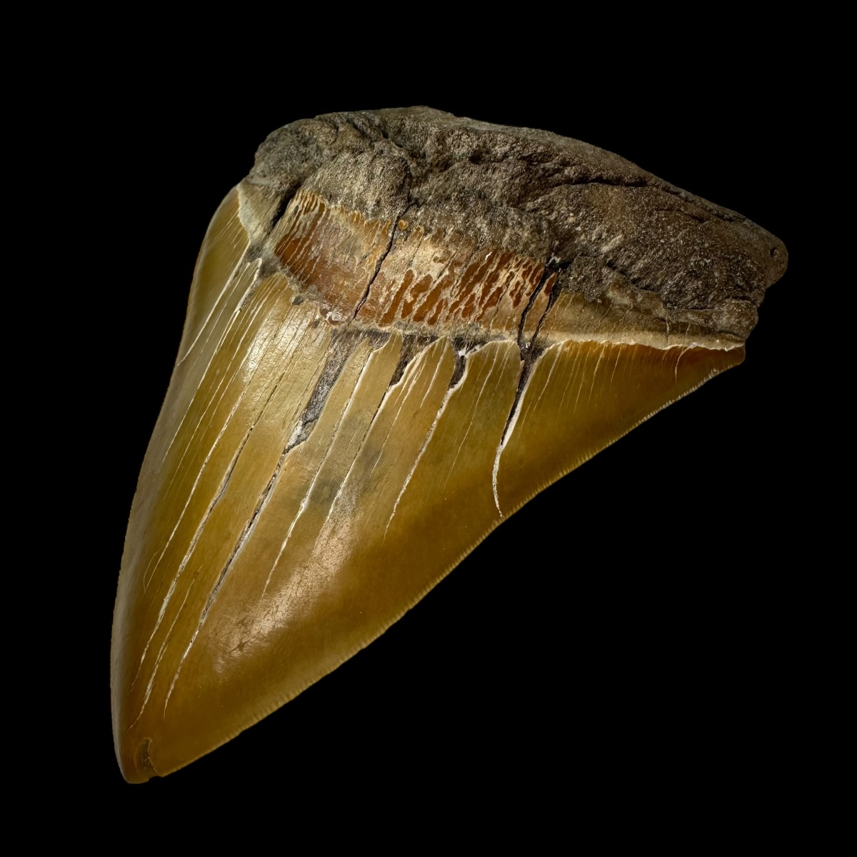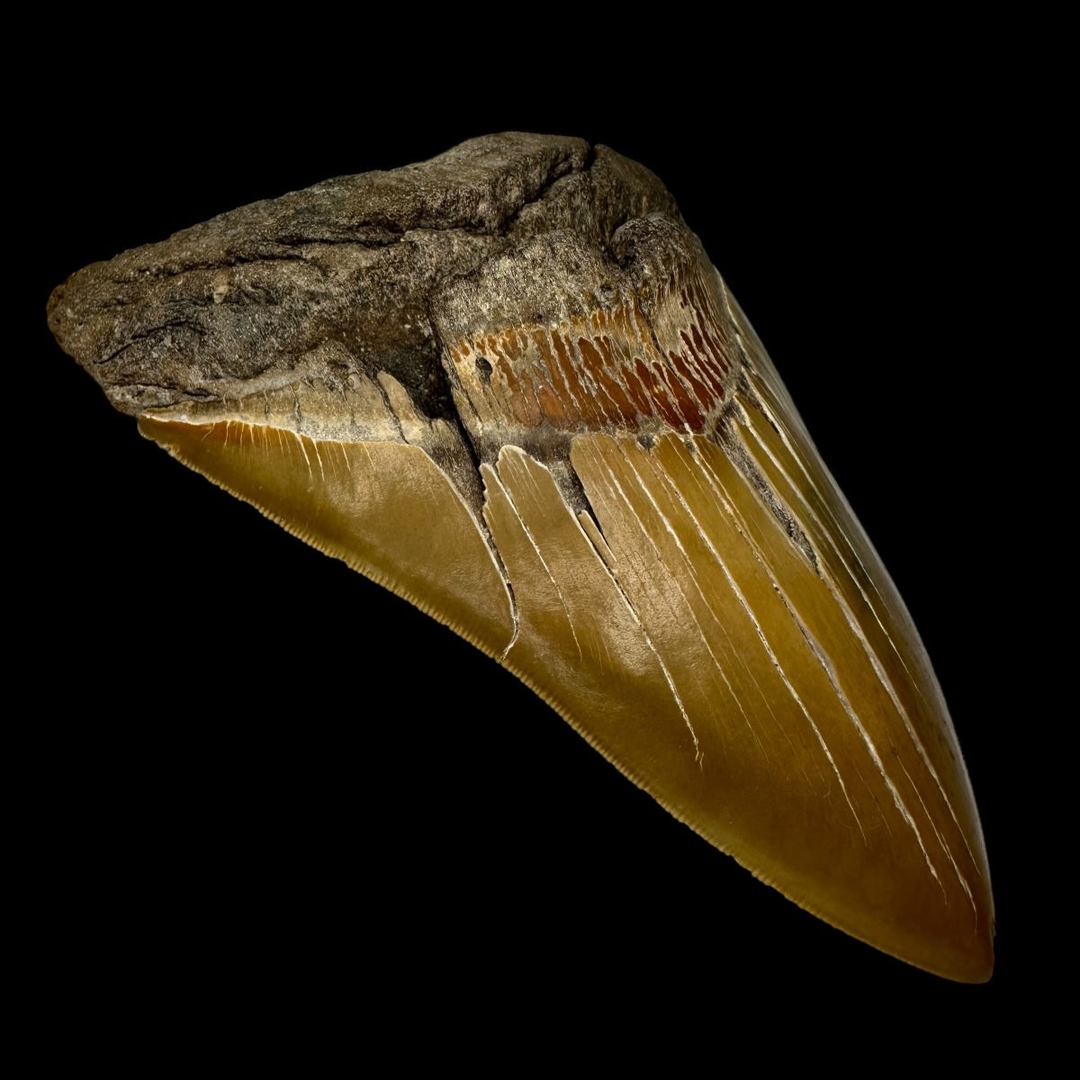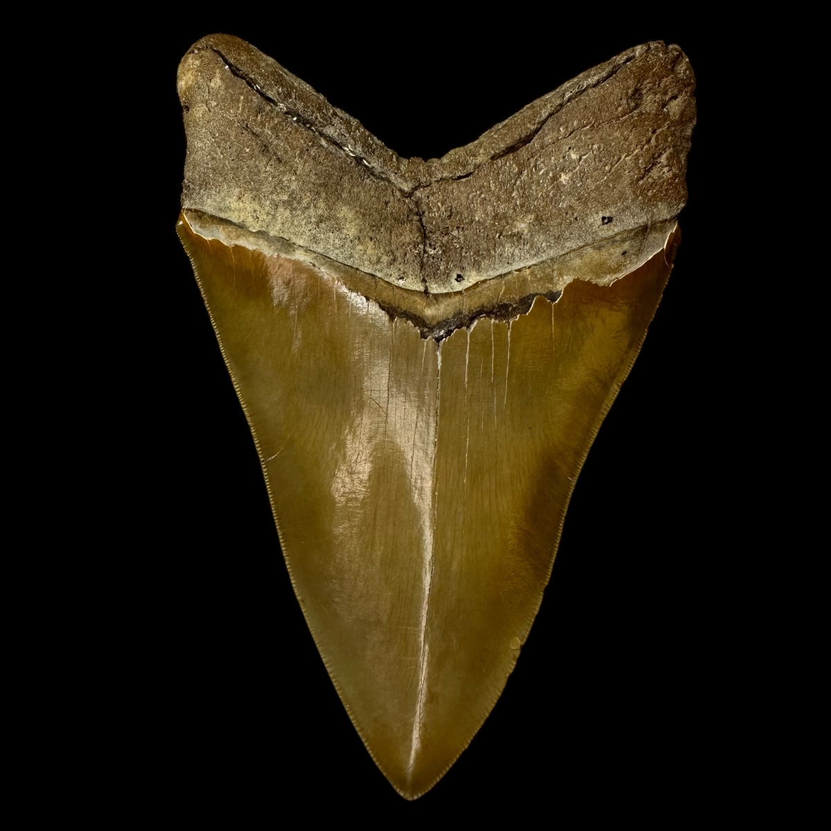 Every Megalodon tooth fossil we offer is completely natural, with no repairs or enhancements—just a light cleaning to remove marine deposits. Each piece is one-of-a-kind, showcasing its own distinctive coloration, sharp serrations, and natural gloss. This Megalodon tooth fossil is a true collector’s treasure, combining authenticity, prehistoric value, and unmatched detail.